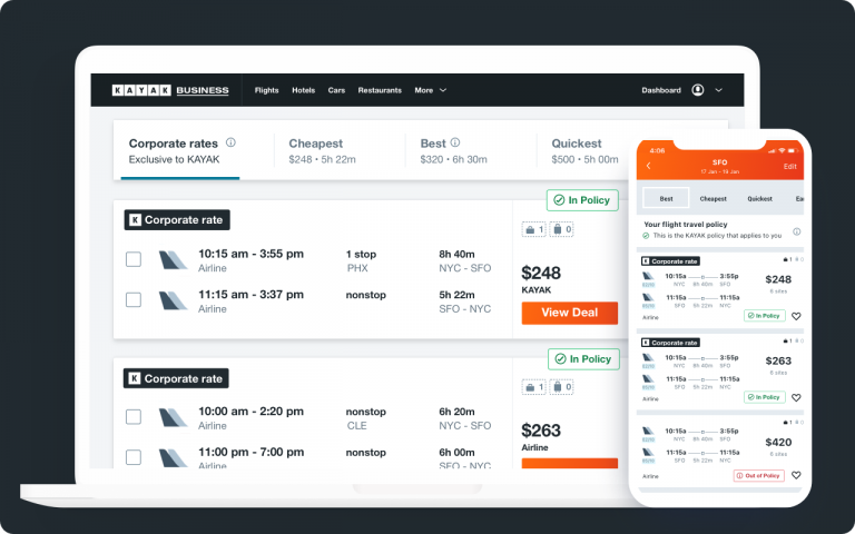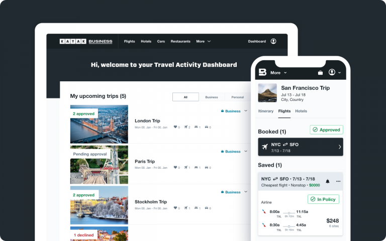 Unlike most business travel platforms, KAYAK for Business doesn’t sell or process your tickets and reservations. Instead, we search many airlines, travel agents and hotel sites to find the best prices and availability, which gives you the flexibility to book with the site you want. We make sure to find you the options that you need for business travel.
